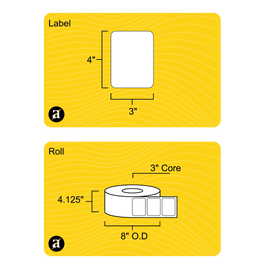 White thermal transfer, 4" x 3" weatherproof paper label on a 3" core with an 8" outer diameter which meets the specification of most industrial-sized (3" core) printers including Zebra, Datamax, Sato, Intermec, Printronix, Brother and more. This particular label has all-temperature permanent adhesive. Our labels are perfect for applications that include: shipping, barcoding, inventory tracking, and much more. The quality of our thermal paper ensures that the print will be dark enough for reliable label use. These labels are also perforated making for an easy tear.